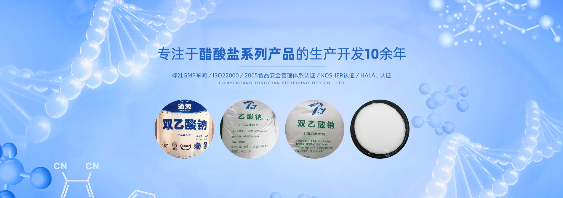 連云港市通源生物科技有限公司 是生產(chǎn)雙乙酸鈉、無水醋酸鈉、三水醋酸鈉、醋酸鉀、乙酸鈉、丙酸鈉、丙酸鈣和氯化鉀等系類醋酸鹽產(chǎn)品的專業(yè)制造商。公司專注于醋酸鹽系列產(chǎn)品的生產(chǎn)開發(fā)10余年,是國內(nèi)專業(yè)醋酸酸鹽產(chǎn)品生產(chǎn)基地。 目前,我們已和全球30多個國家和地區(qū)建立長期的業(yè)務(wù)合作關(guān)系,是中國較大的雙乙酸鈉生產(chǎn)商和出口商之一。作為中國食品添加劑和配料協(xié)會理事單位,通源公司已建成標(biāo)準(zhǔn)GMP車間5000余平方米,通過了ISO22000:2005食品安全管理體系認(rèn)證、KOSHER認(rèn)證、HALAL 認(rèn)證等,這些都是我們提供高質(zhì)量產(chǎn)品和優(yōu)良服務(wù)的前提和確保。 生產(chǎn)出色產(chǎn)品,提供優(yōu)良服務(wù),滿足顧客需要,是我們努力的目標(biāo)。愿和我們的朋友們攜手,共...